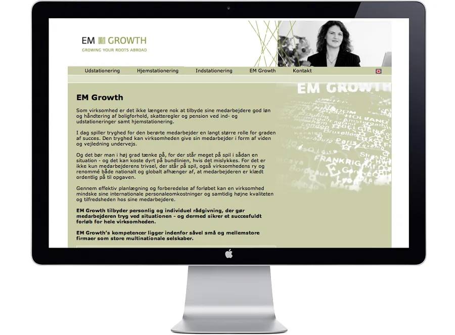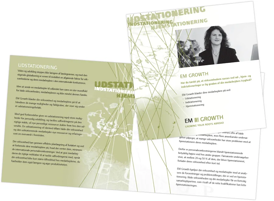 Visuel identitet for EM Growth, der hjælper virksomheder med coaching af både medarbejdere og deres familiemedlemmer i forbindelse med ind- ud- og hjemstationering. Det handler om at skabe tryghed og ikke bare gode fysiske rammer.